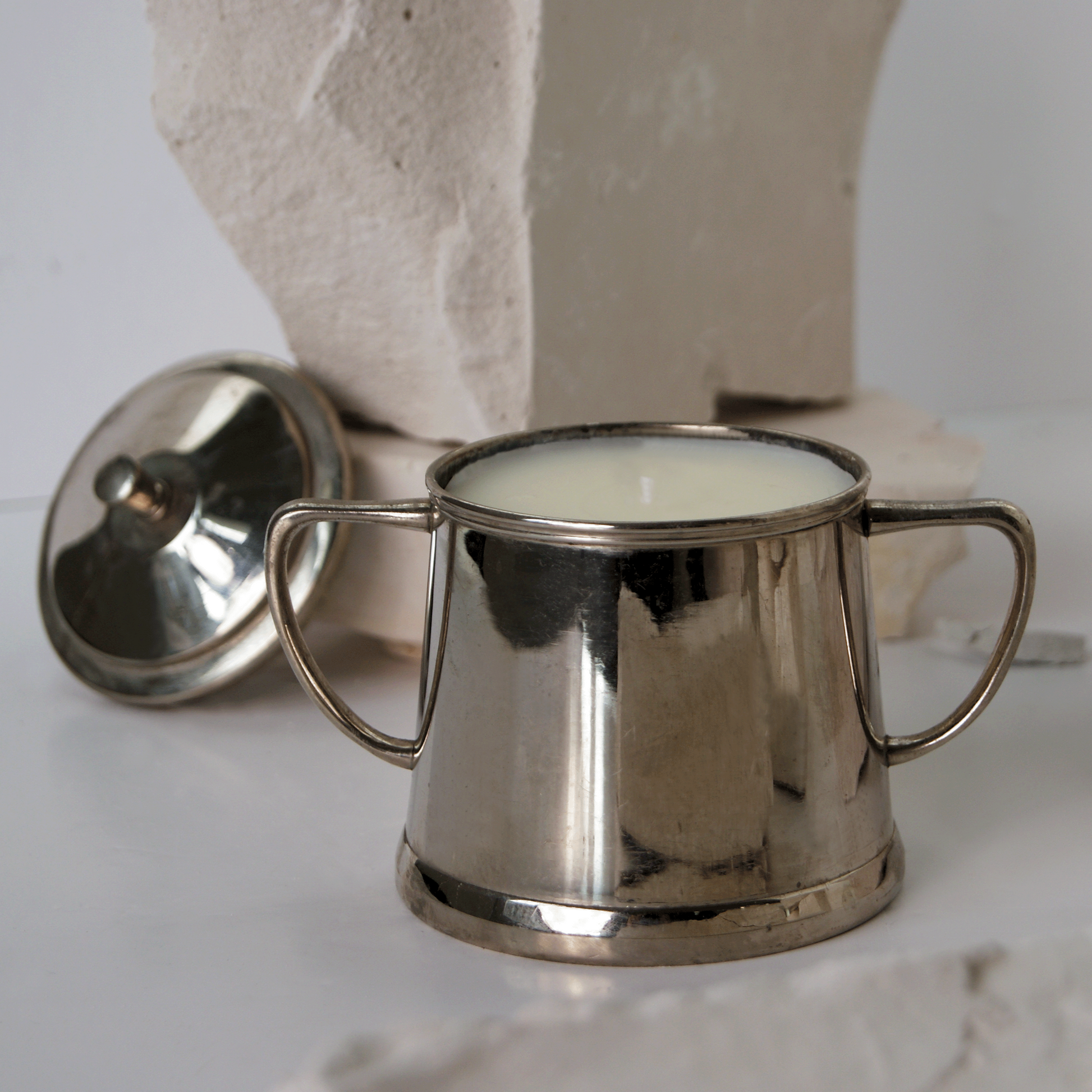 Discover the beautifully crafted candle in a vintage stainless steel cup. All cups are one of a kind, sourced from local markets. The candles are handpoured with natural soy wax which allows the candle to burn down evenly.